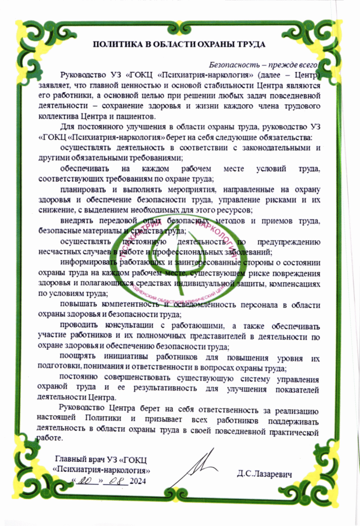 Для постоянного улучшения в области охраны труда, руководство УЗ «ГОКЦ «Психиатрия-наркология» берет на себя следующие обязательства: